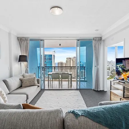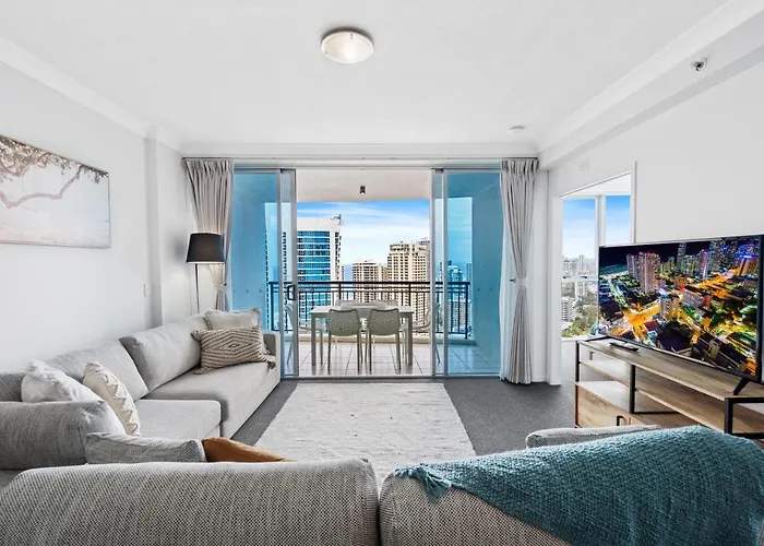 Chevron Renaissance Stunning Apartment 29FL Sleeps 6 - Optimise BNB Gold Coast spacieux est situé à moins de 10 minutes en voiture des Dracula's Cabaret Restaurant Gold Coast et à 2 km de la Home of the Arts. Doté d'un solarium avec vue sur la mer, le domicile de 120 m² se trouve assez proche de l'Infinity Attraction.